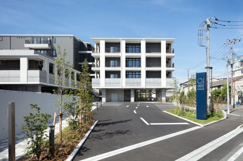 4階建ての特別養護老人ホーム。従来の木造建築とは異なる四角い箱状の建物、こうしたシンプルなファサードは、これからの中層木造建築のイメージのひとつの選択肢となるだろう。これからの都市型の中層木造建築の提案として、木材を多用しながら敢えて木造らしさを消した2x4工法ならではの挑戦である。