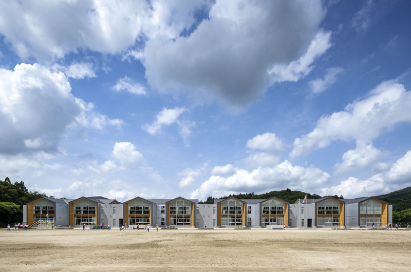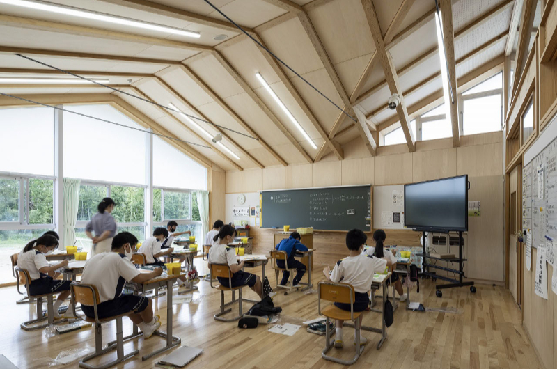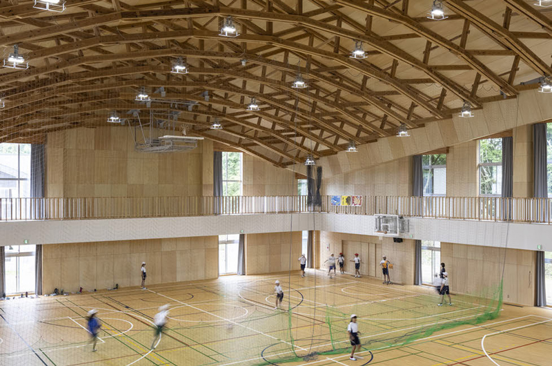 2階建ての大規模な木造校舎を別棟解釈により製材で計画。RC造による耐火構造のコアと鉄骨造による渡り廊下で木造ユニットを結びながら象徴的な中庭を囲むように建物群が配置されている。切妻屋根の木造ユニットと耐火構造ユニットの連続による南側のファサードも特徴的。一般的な技術の組み合わせながら変化にとんだ建物構成が見事。