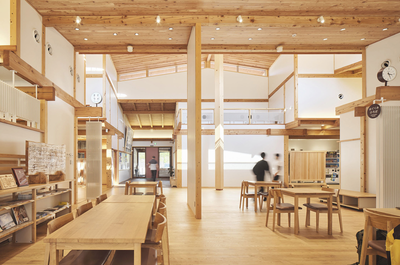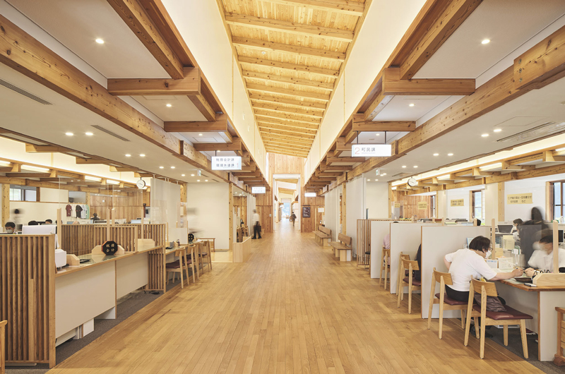 大規模の木構造が町の役場としての規模感をうまく作り出している。大仰に見えない構造やスケール感が平屋の大屋根空間の下で役場と住人のコミュニケーションの距離感を近づけているように見える。また、檜で知られる木曽の林業をアピールする意味でも評価される建物である。