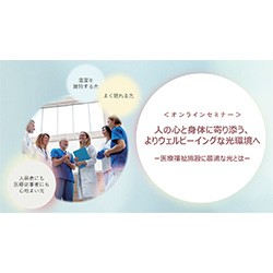 | 概要 | 様々な人が利用する医療福祉施設。 ・医療福祉施設に最適化された光 お年寄りから子ども、病気の人、健康な人、働く人に、光が心と身体に寄り添う、よりウェルビーイングな光環境とは。 |
