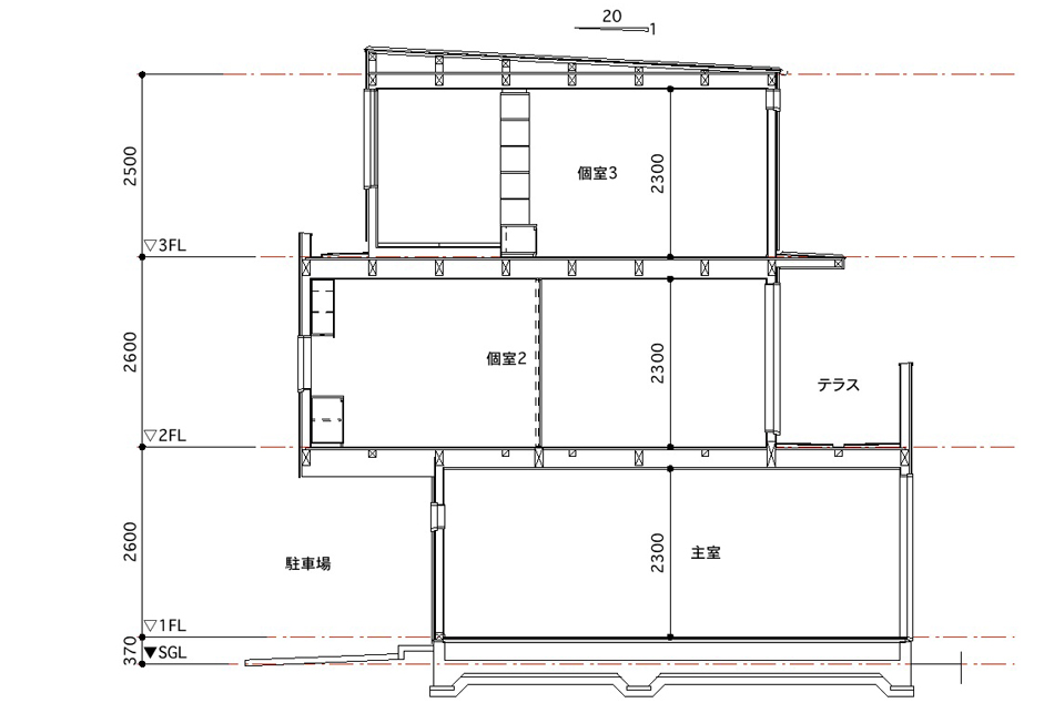 各階は他の階と関連を持たず、階段のみで繋がっています。その結果、3つの層が少しずれながら重なり合った形態になっています。断面的な凹凸は、ピロティ(駐車場)となったり、屋外テラスとして利用されています。