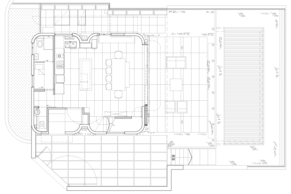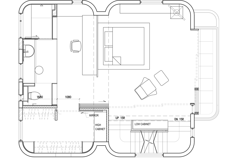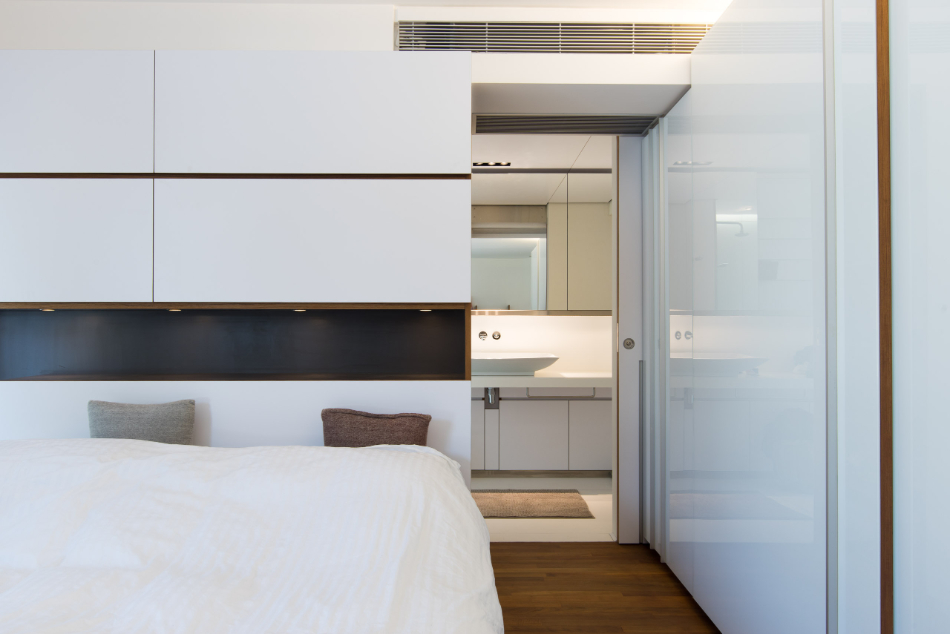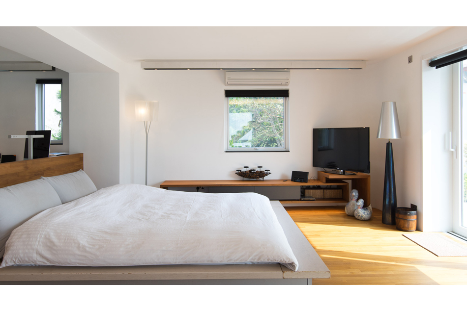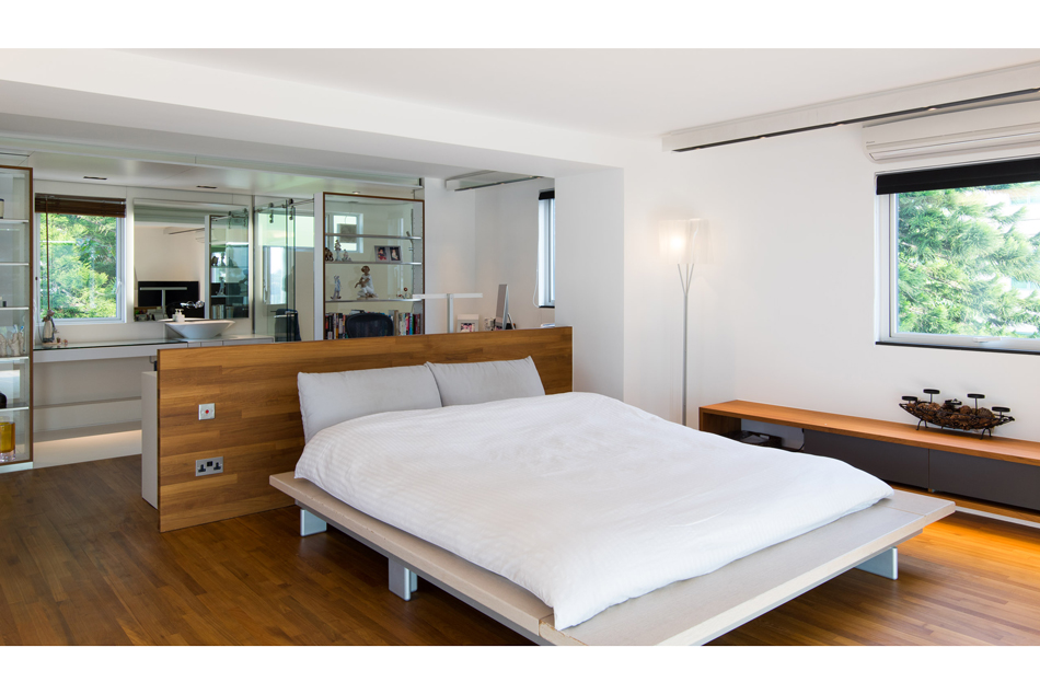 The townhouse was a typical 3-storey New Territories “village” house built in the 1970s with a sizeable sunken garden. The reinforced concrete bearing wall structure allowed complete flexibly of partitioning of internal spaces. The standard 65s.m. floor plate could hardly accommodate an open kitchen, dining room and living room on the ground floor. We have therefore moved the sparsely used living area to the outdoor deck and have a open kitchen and large dining/work table in the main living space. This open approach is also reflected on the top floor master suite where the sleeping, study, bathroom and staircase are all one space without partitions, with the room boundary at the middle floor corridor.