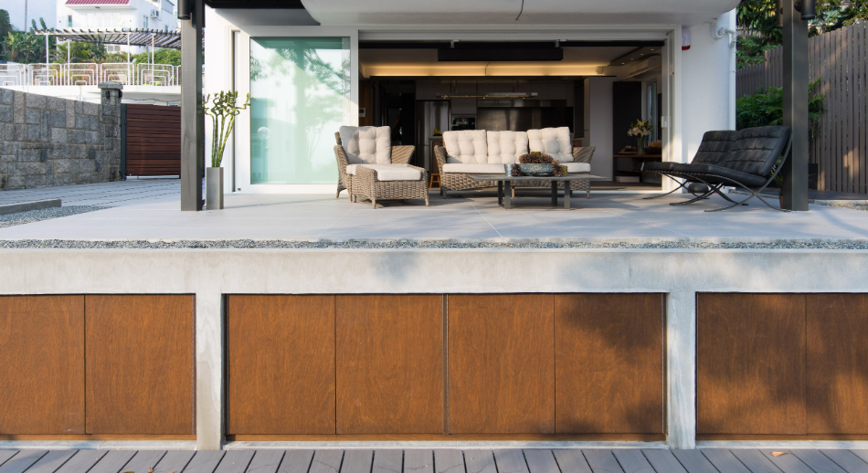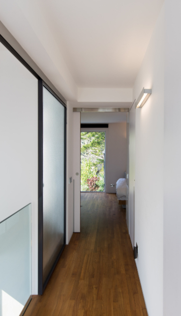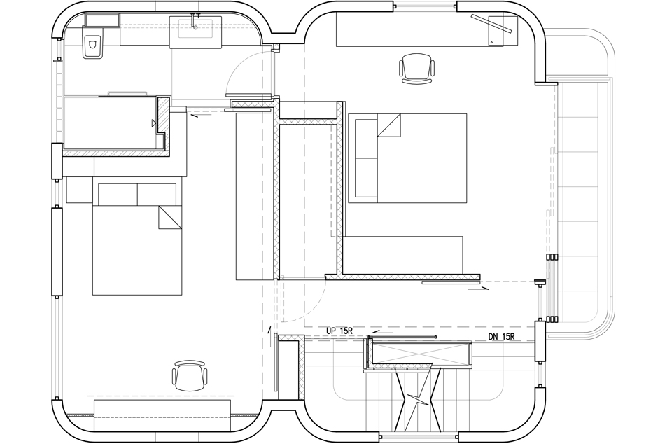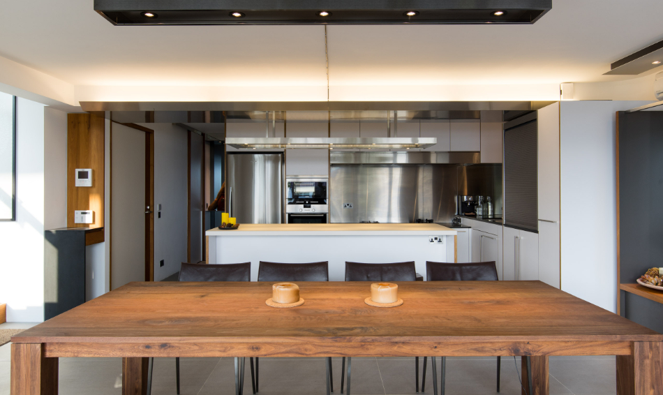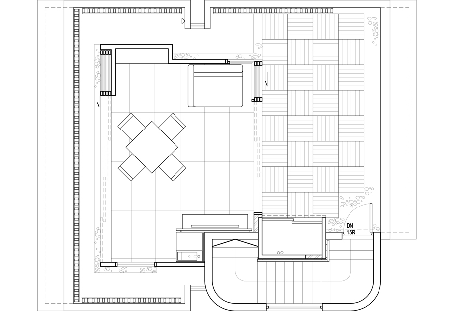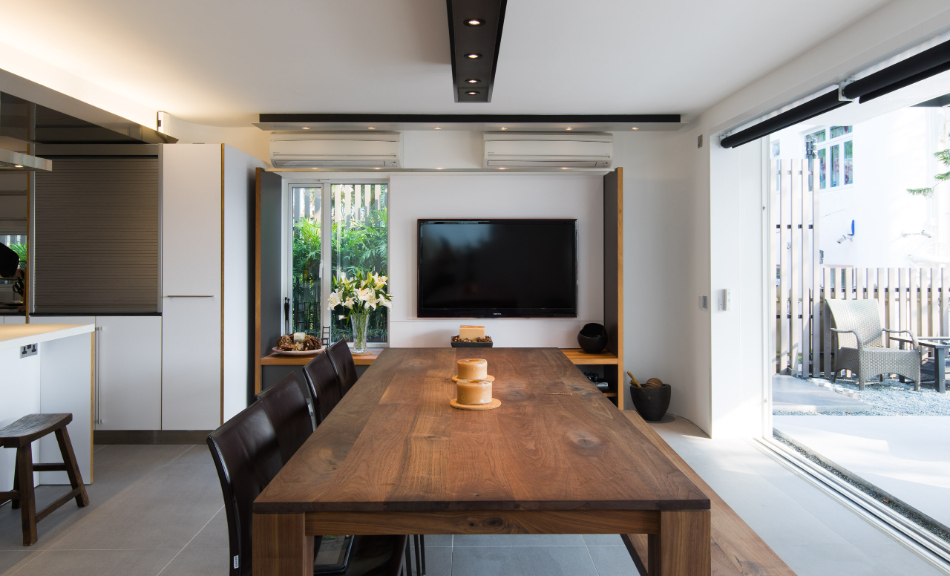 このタウンハウスは、新界エリアに1970年代に建てられた典型的な3階建てビレッジハウスで、広めのサンクンガーデンを備えています。構造は鉄筋コンクリート造の耐力壁構造でしたので、内部空間を柔軟に仕切ることができました。65㎡の床面積では、1階にオープンキッチン、ダイニング、リビングをすべて収めるのは困難だったので、使用頻度の低いリビングエリアを屋外デッキに移し、メインの居住空間にはオープンキッチンとダイニング/ワークテーブルを設置しました。この開放的なアプローチは、最上階の主寝室にも反映されており、寝室、書斎、浴室、階段が仕切りのない一体空間となり、空間の境界は中間階の廊下となっています。