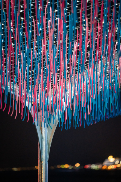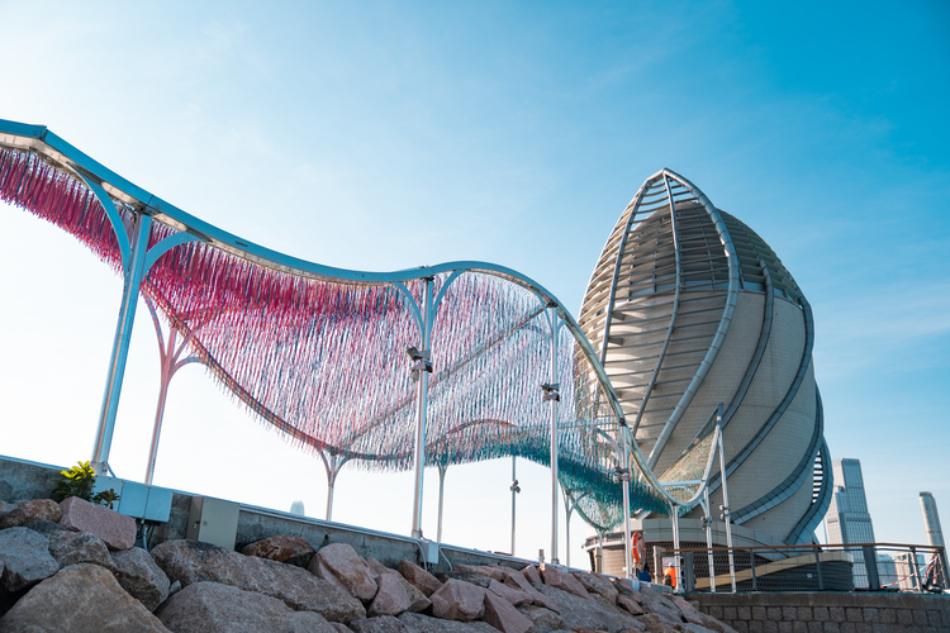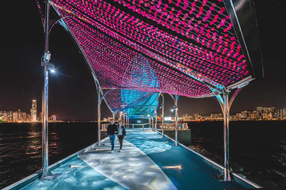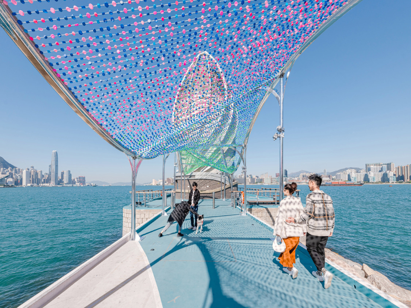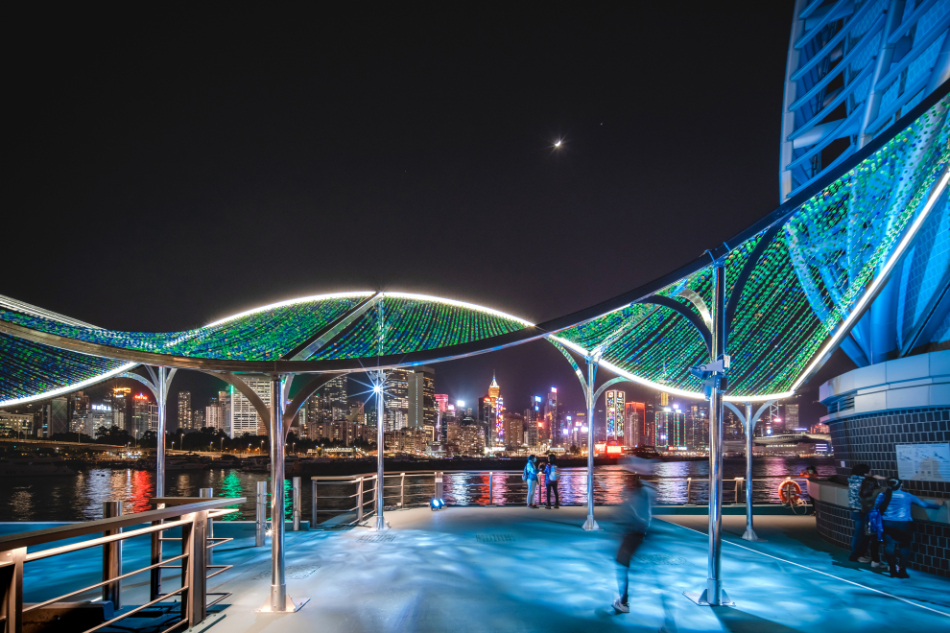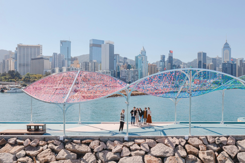 The roofscape of “Harbour Wave 1.0” is composed of over 30,000 colourful plastic bottle caps, while “Harbour Wave 2.0” is composed of over 15,000 nos. of recycled plastic (rPET) ropes.