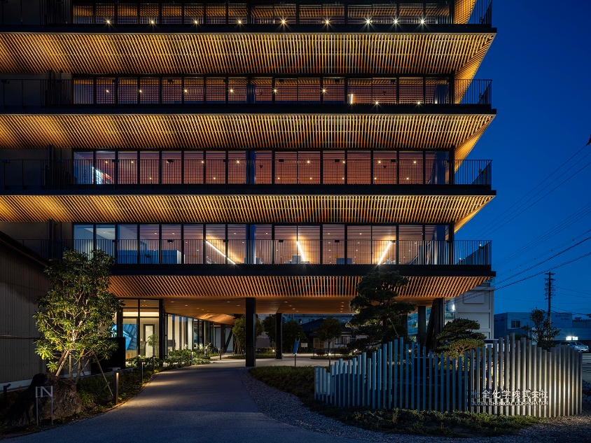 外周はガラスファサードで、工場群や神通川、立山連峰を眺めることができる。また外周部にはバルコニーが設けられており、社員がリフレッシュできるだけでなく、ペリメーターゾーンの環境調整装置としても機能している。内部の天井は国産針葉樹のルーバーで覆われており、自然で温かみのある空間になっている。