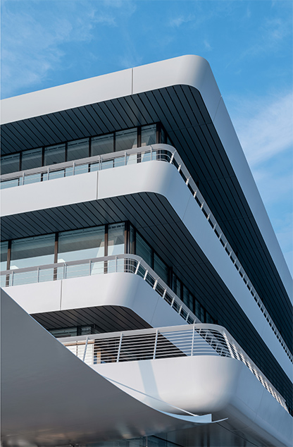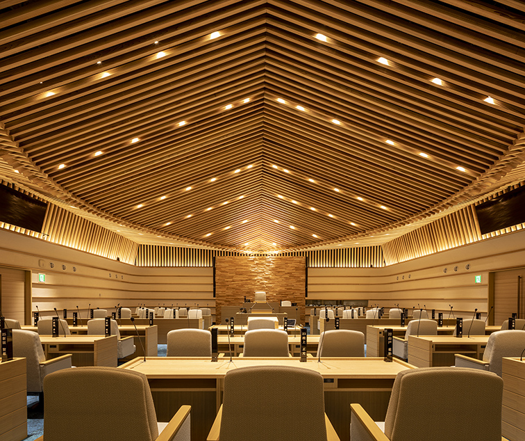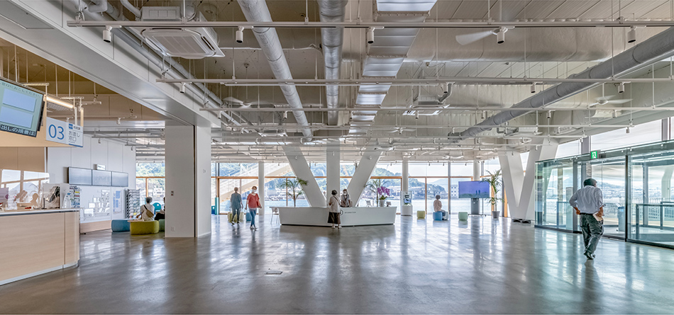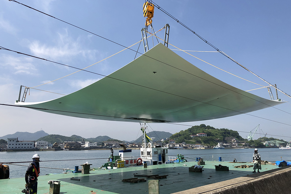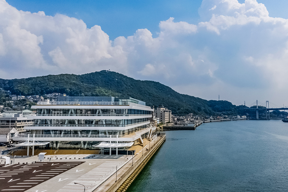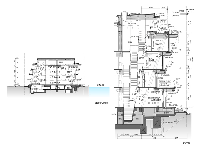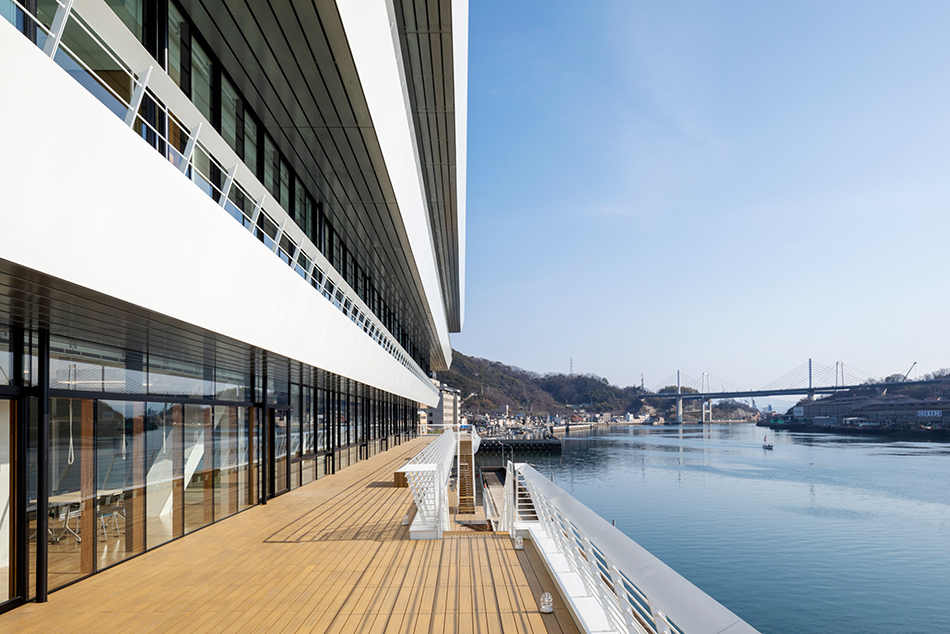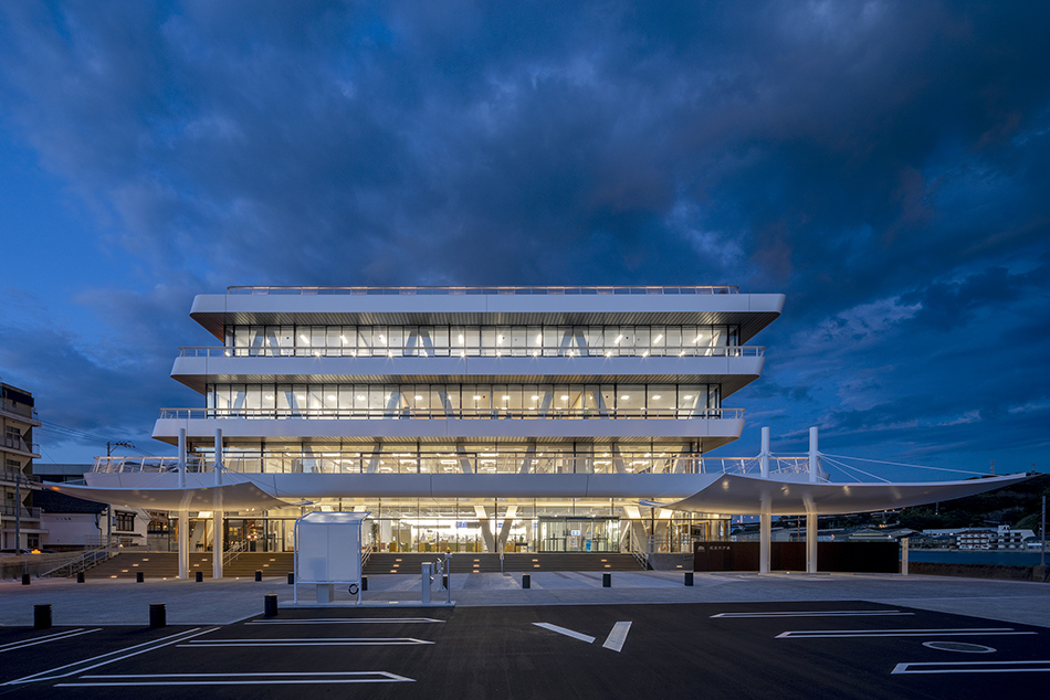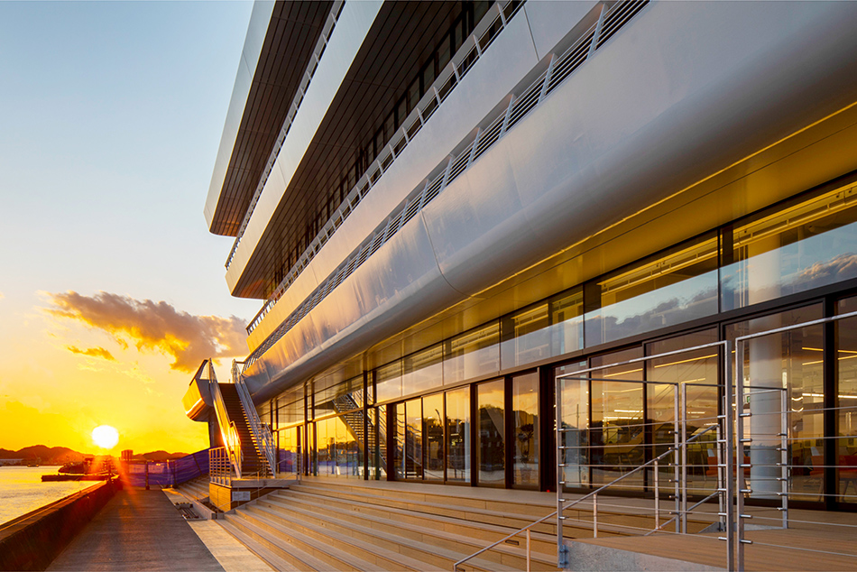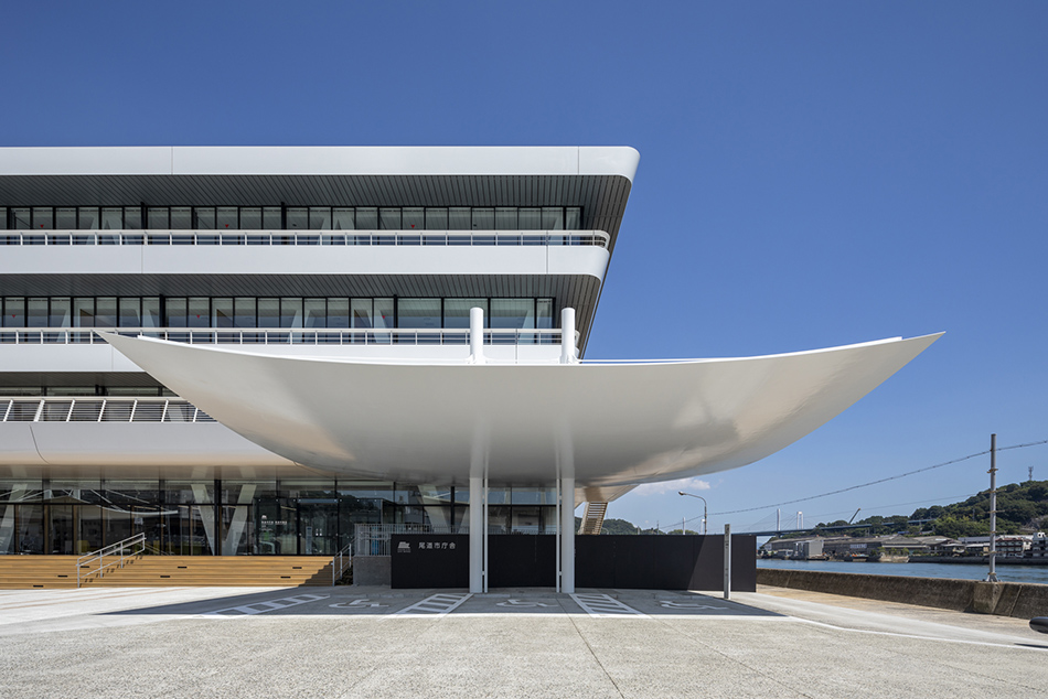 「尾道水道が紡いだ中世からの箱庭的都市」として日本遺産に認定された尾道市にあって、市民の活動拠点となり、かつ観光客にも開かれた新名所となるような「海に寄り添う市庁舎」を計画した。瀬戸内海に面する稀有な立地条件を生かし、海側に傾けた建物形状とすることで、視界から海以外のものを消し去り、まるで海の上にいるかのような感覚を生み出している。外装では、尾道の主要産業の一つ、造船業とコラボレーションし、地元の造船会社で製作した厚さ12㎜の鉄板に撓(ぎょう)鉄技術を施すことで、三次元曲面による柔らかで艶やかな表情を与えた。資材を海から運搬する計画とすることで大きさの制約をなくし、幅18mの外装鋼板や約13m角の鋼板庇など、建築的スケールを超えた外装表現を可能としている。造船業では“あたりまえ”とされた技術を建築に持ち込むことで、既存産業の枠組みを超えた建築デザインの可能性を追求した。
