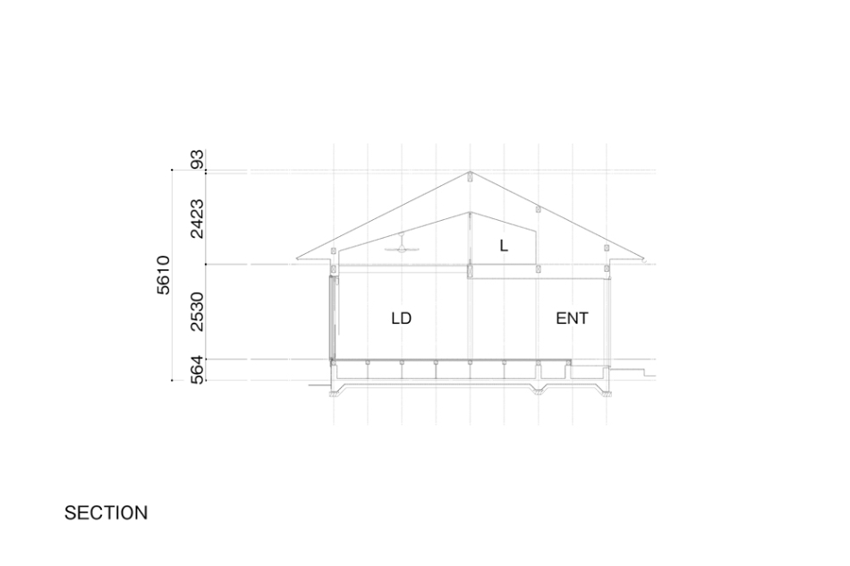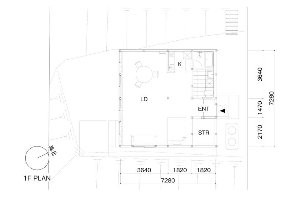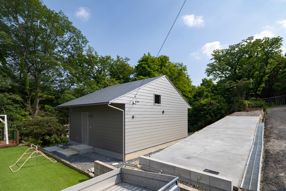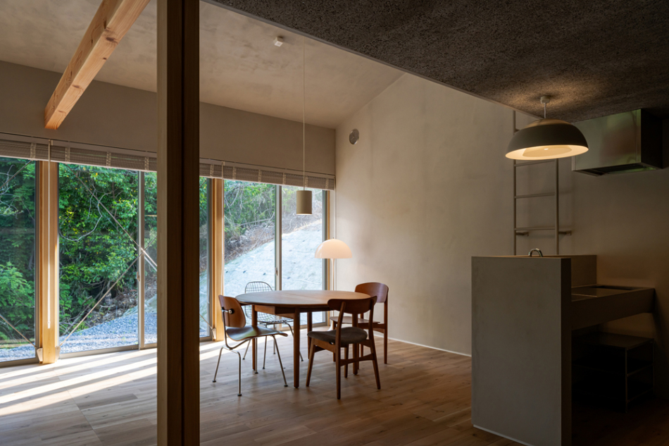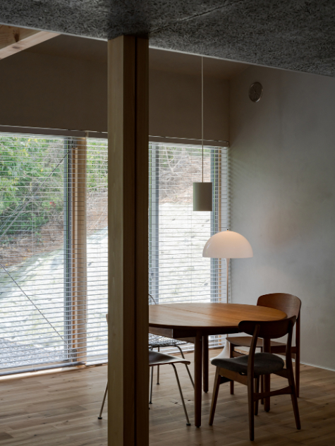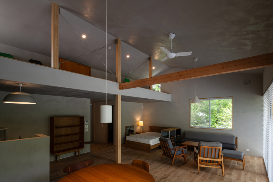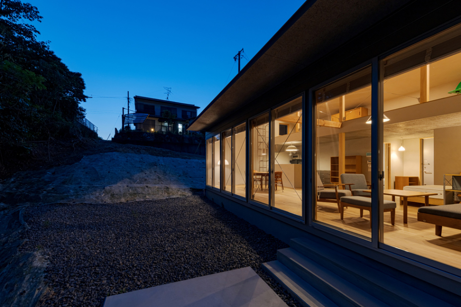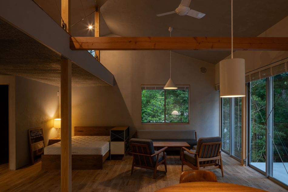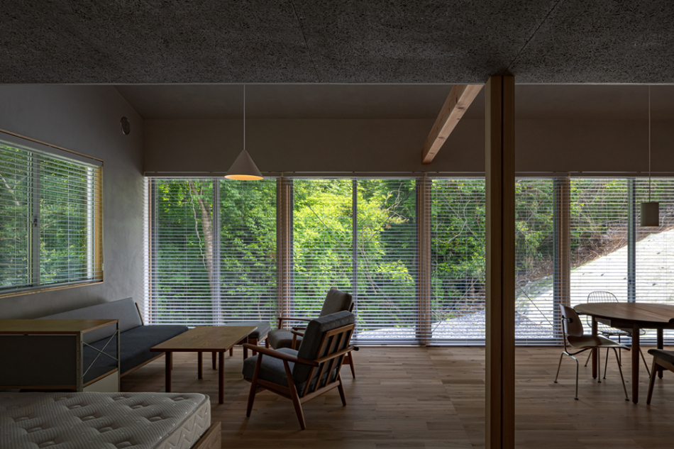 雑木林に面するという環境を活かすべく、木々に面さない2面は基本窓を設けず、プライバシーが確保された南側を全面開口としています。林のある面にのみ開くことで、木々を通して、天候、時間、季節の変化と対峙しつつ日々の生活をおくる、環境にも恵まれた住宅となりました。