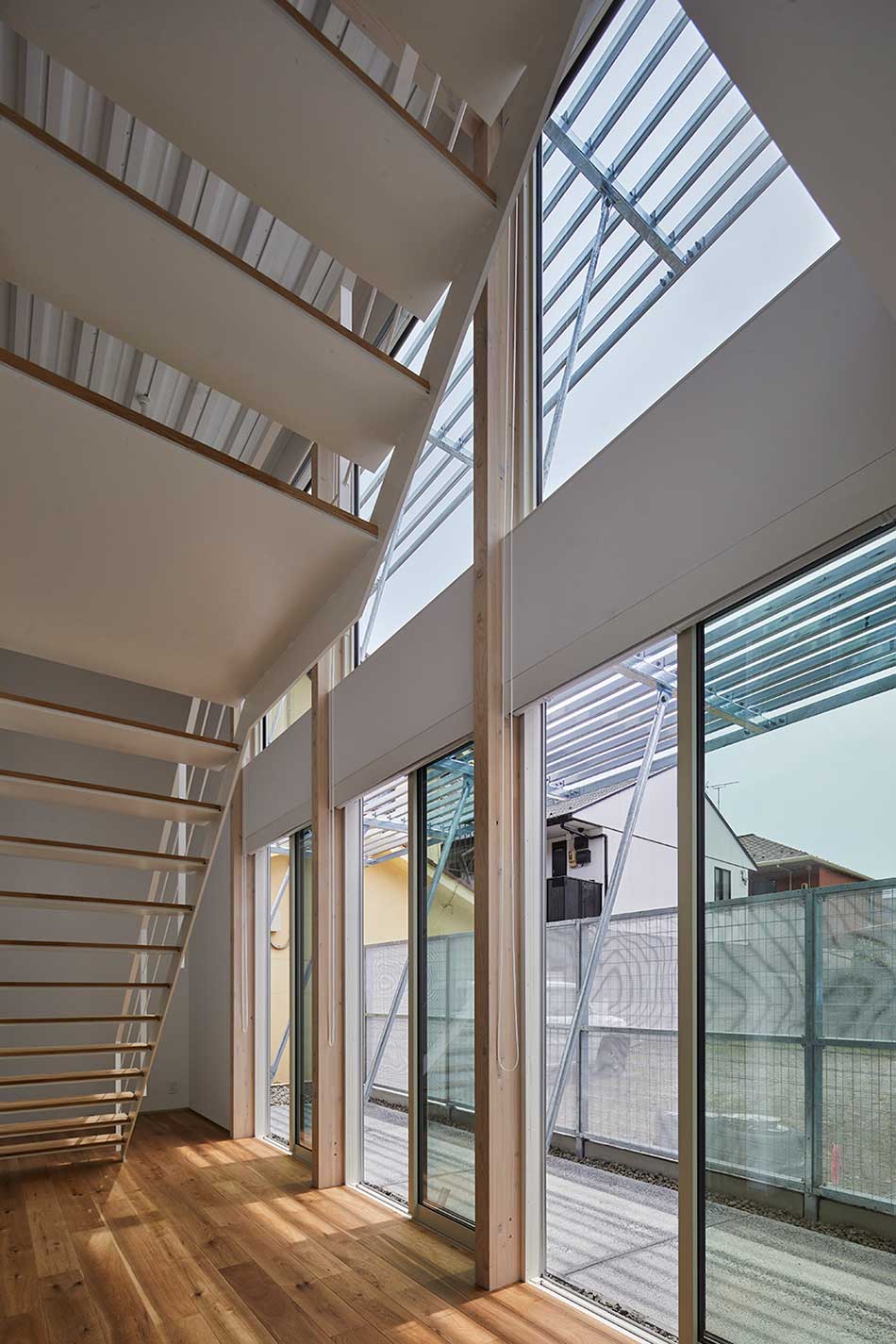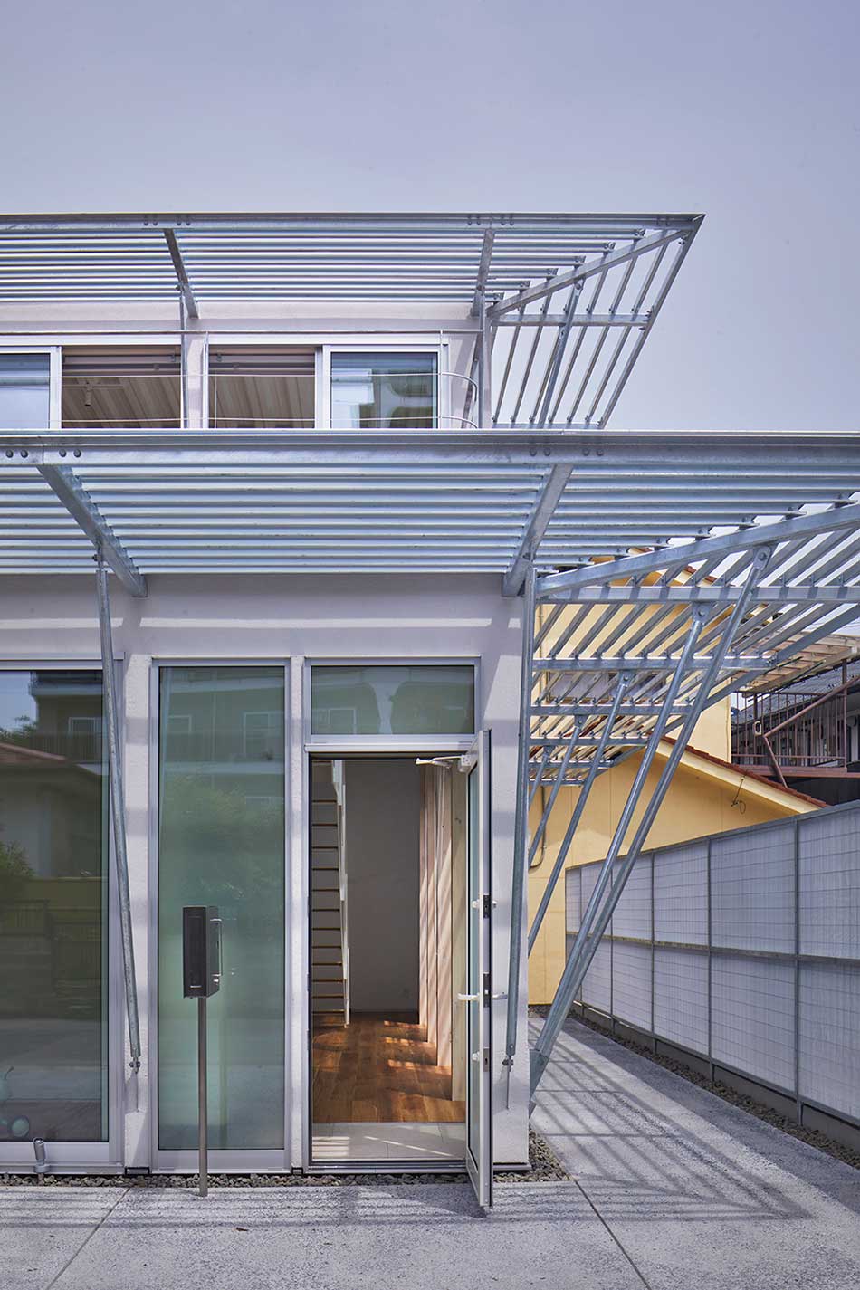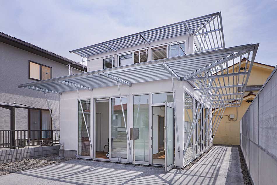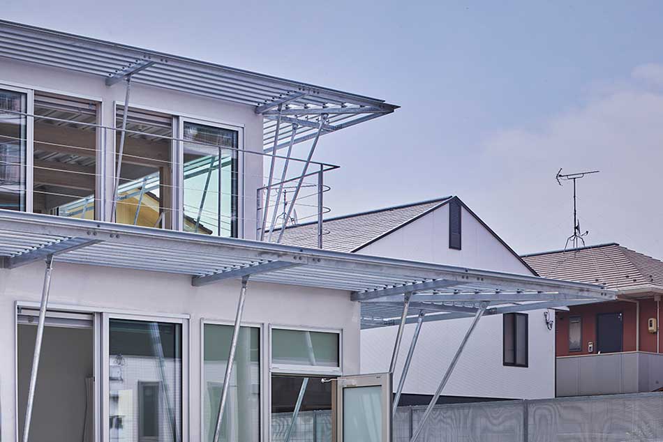 庇のような羽が周辺環境とそれぞれを繋ぐ住宅。