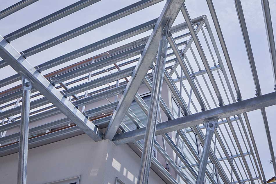 工法では、主要構造を木造としつつデッキプレートで屋根と床の面を構成することで、柱と大梁以外の木使用量を減らしコストと工期の省略を試みた。