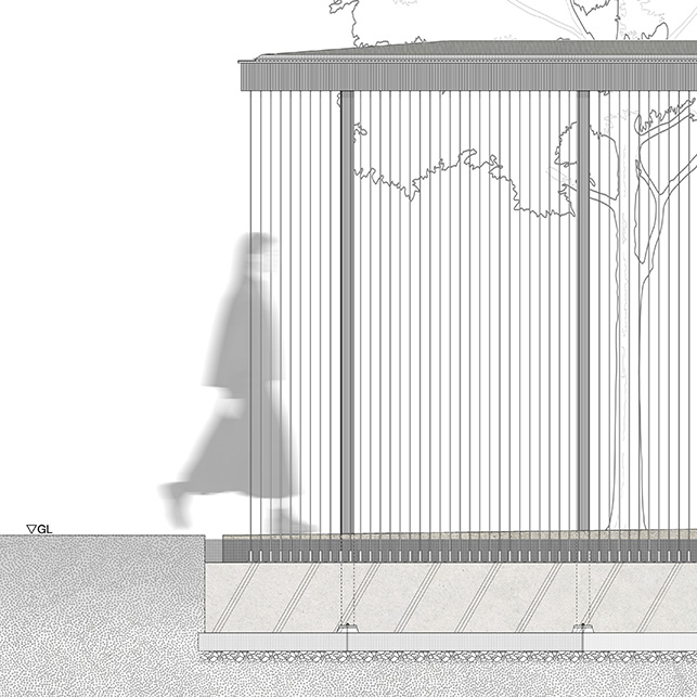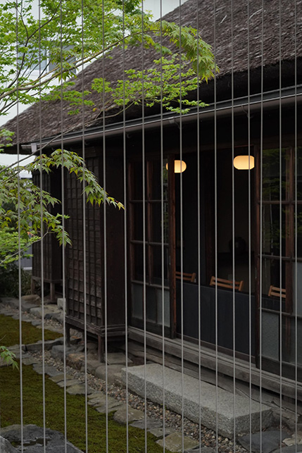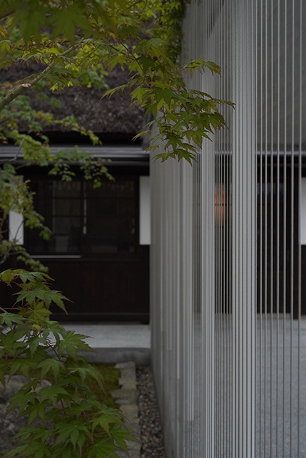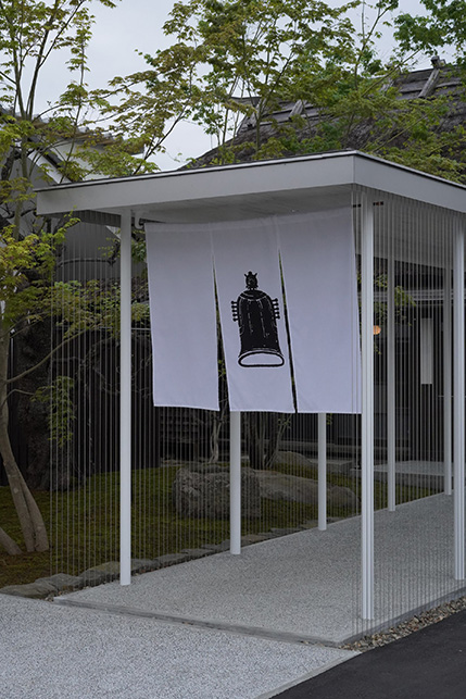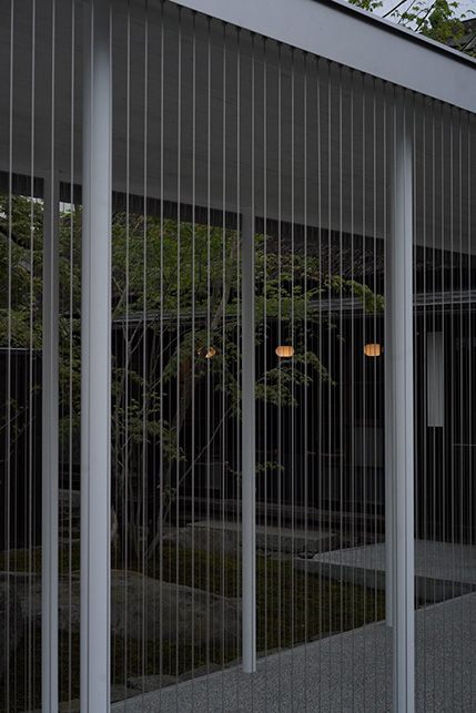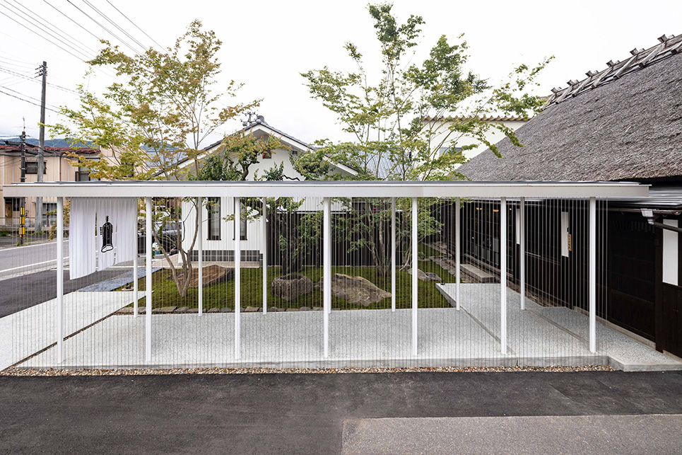新ポーチの計画にあたって、白石温麺の製造工程に見られる ” ハタ” と呼ばれる乾燥台に干される温麺の風景に着目しました。整然と並ぶ温麺のレイヤーは美しく、それは製麺文化そのものを表現していました。そしてこの風景をモチーフとすることで、この場所が培ってきた歴史や営みを空間化できるのではないかと考えました。新ポーチの両側面には3φのテンションワイヤーを合計286本を使用しました。この空間は食前の高揚感と食後の余韻を演出すると共に、飲食店の広告塔としても象徴的な意味を持ってます。