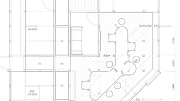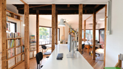 公園方向に開いた窓への軸を生かして、斜めに貼られたフローリングの上に、壁が解体されて剥き出しになった列柱を支持体として、柱の隙間を縫うように1枚の不定形なテーブル板を配置した。此花で事務所を開いた時に購入し、2度の引越しを経て少しづつ変形してきたた天板を一部使用しつつも、スタッフや大学のゼミ生など、時間の経過とともに増員した事務所のメンバーの受け皿として、自然に広がっていく形状を目指した。現在も工事は続いている。(文:NO ARCHITECTS)