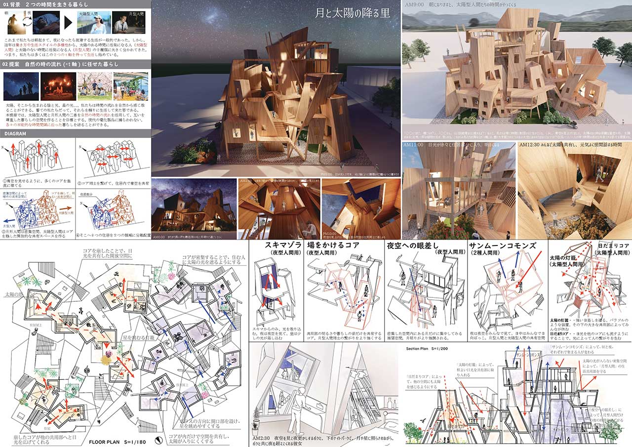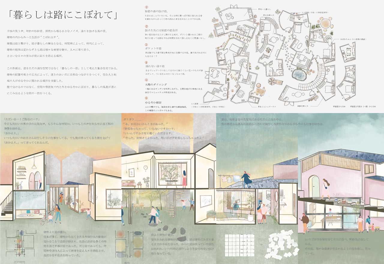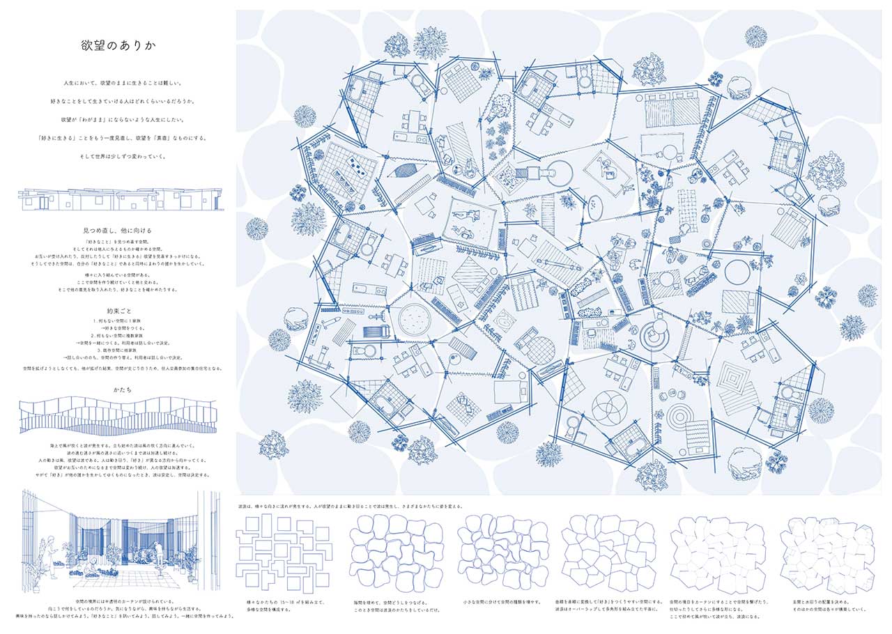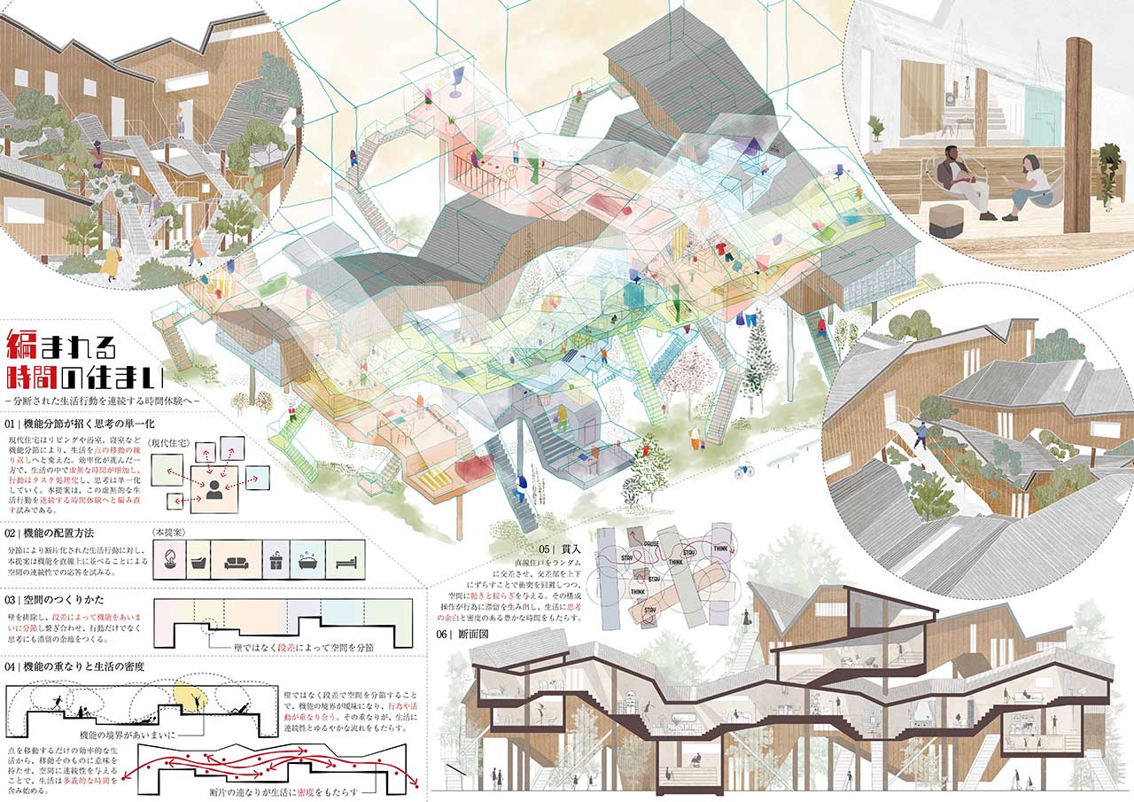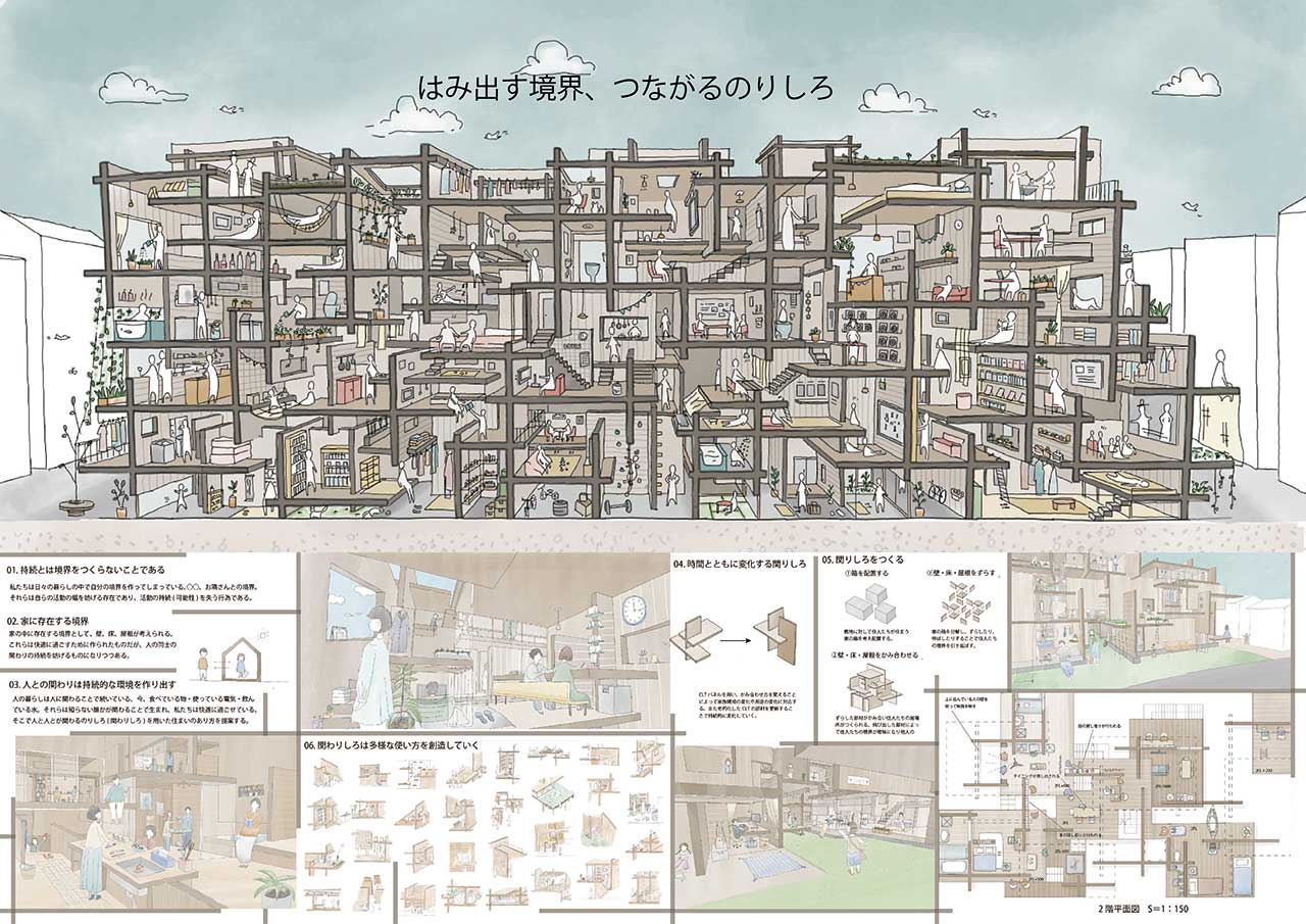 この度は最優秀賞に選出していただき、ありがとうございました。 今回は建築にとらわれず、あえて建築外の視点からアプローチしたことが評価され、大変光栄に思います。 この課題を通して、住み手側に自由を与えつつ、建築自体には、ある程度のルールと居場所を設けることで自由と秩序の両立を考えました。 審査会や懇親会を通して、新たな交流が生まれ、普段得ることのできないアドバイス頂き、卒業設計を含めた今後の設計の大いに活かせる学びとなりました。