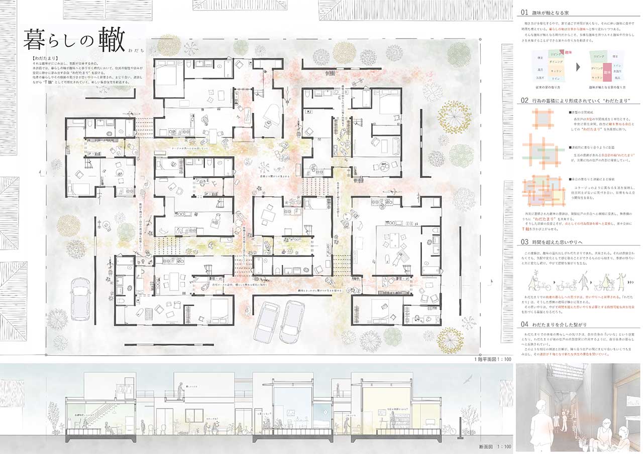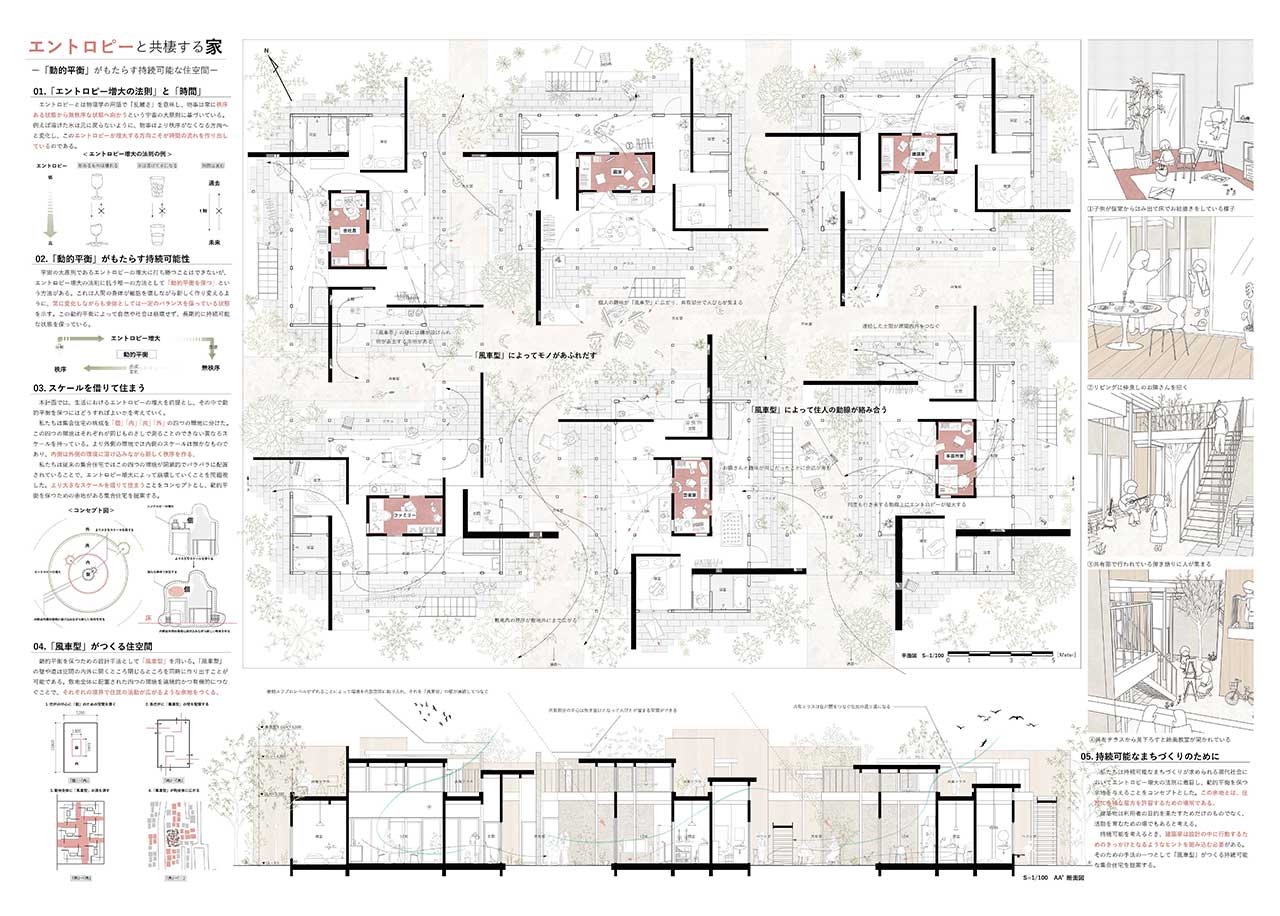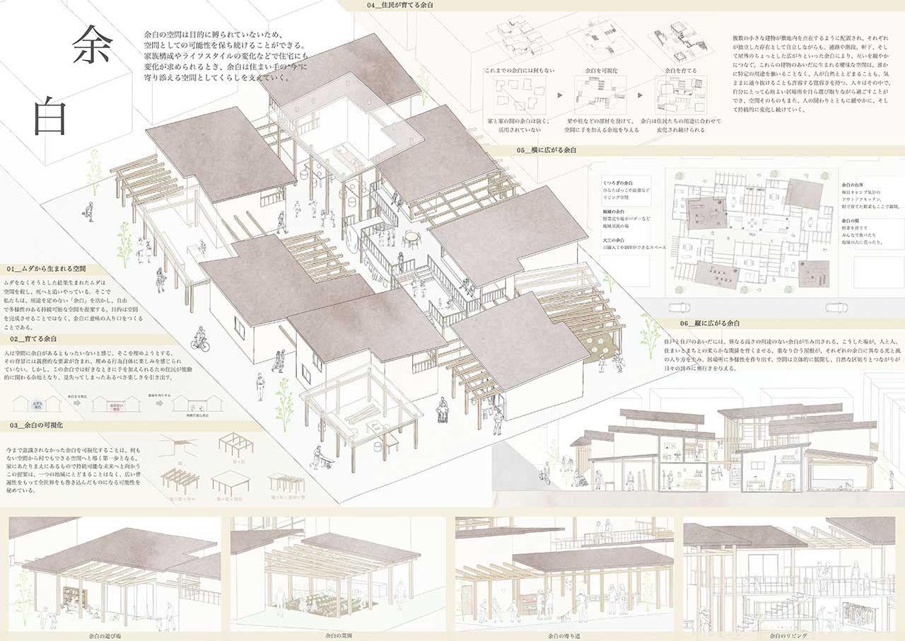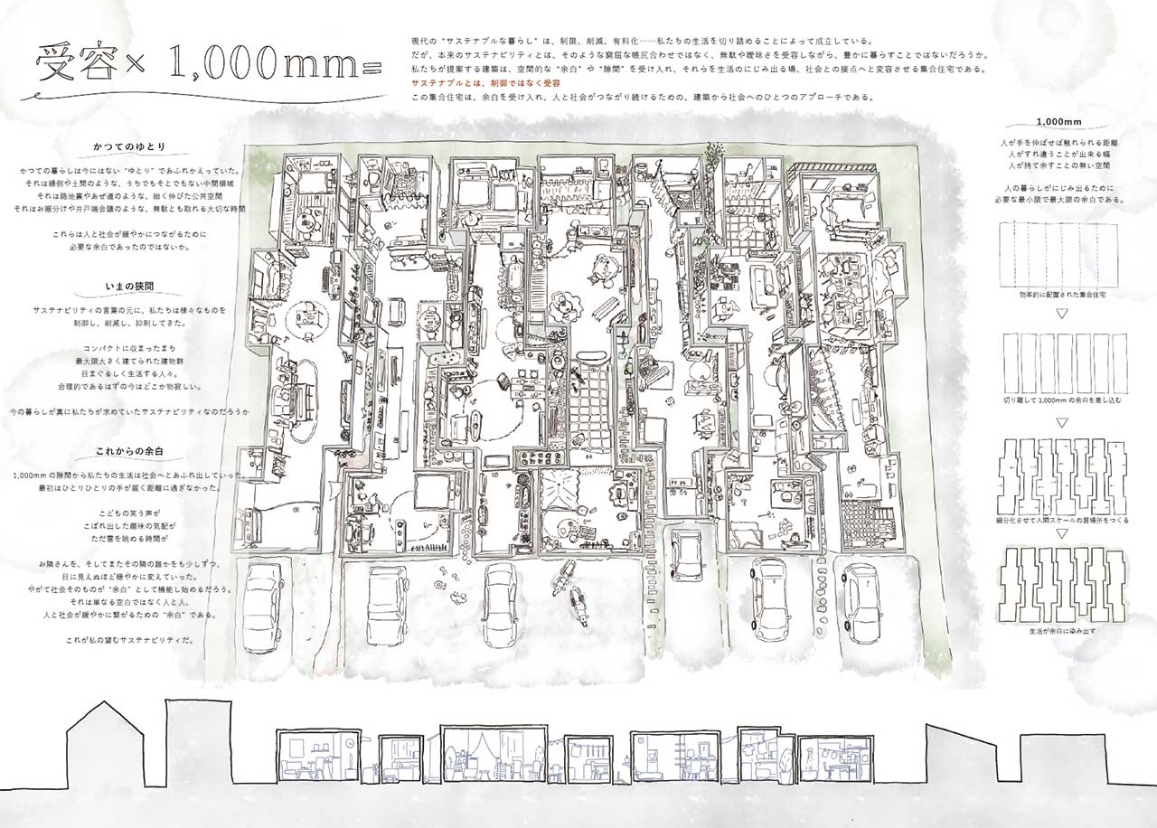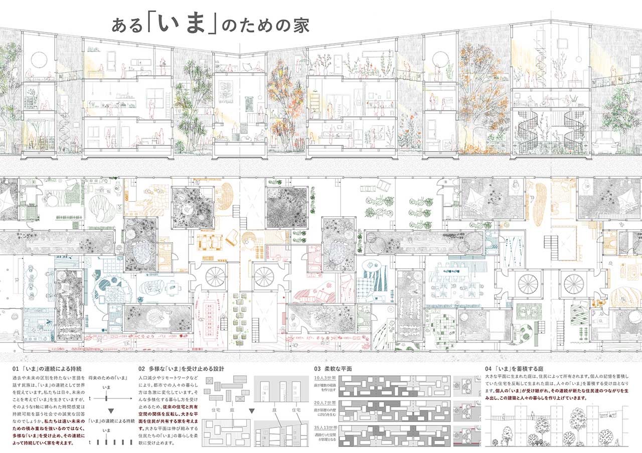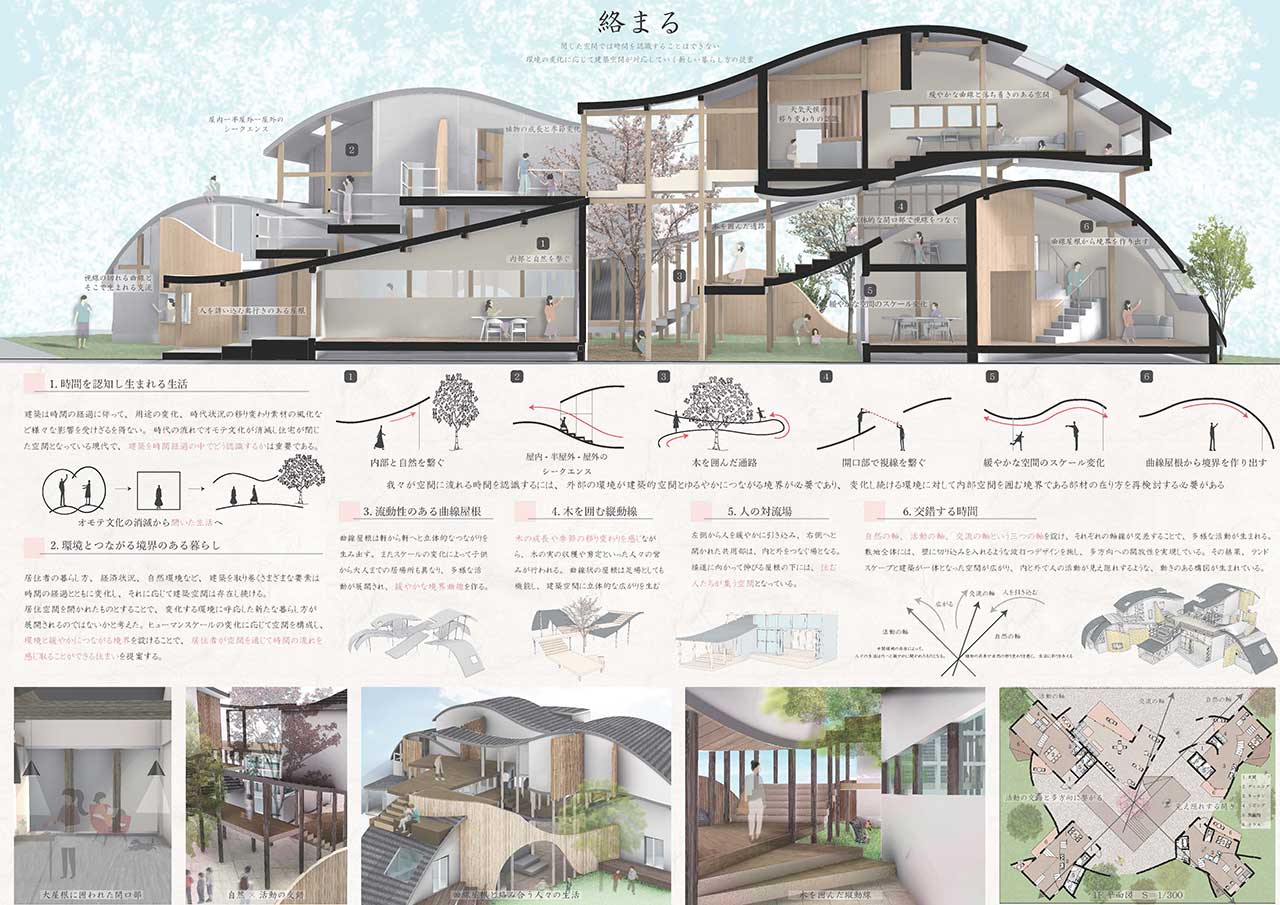 この度は最優秀賞に選出していただき、ありがとうございました。 今回は建築にとらわれず、あえて建築外の視点からアプローチしたことが評価され、大変光栄に思います。 この課題を通して、住み手側に自由を与えつつ、建築自体には、ある程度のルールと居場所を設けることで自由と秩序の両立を考えました。 審査会や懇親会を通して、新たな交流が生まれ、普段得ることのできないアドバイス頂き、卒業設計を含めた今後の設計の大いに活かせる学びとなりました。