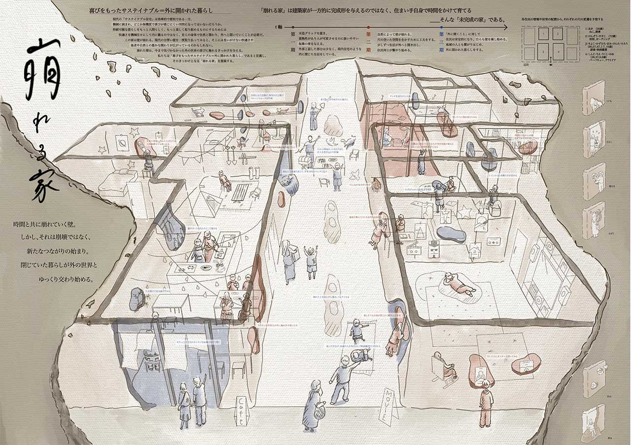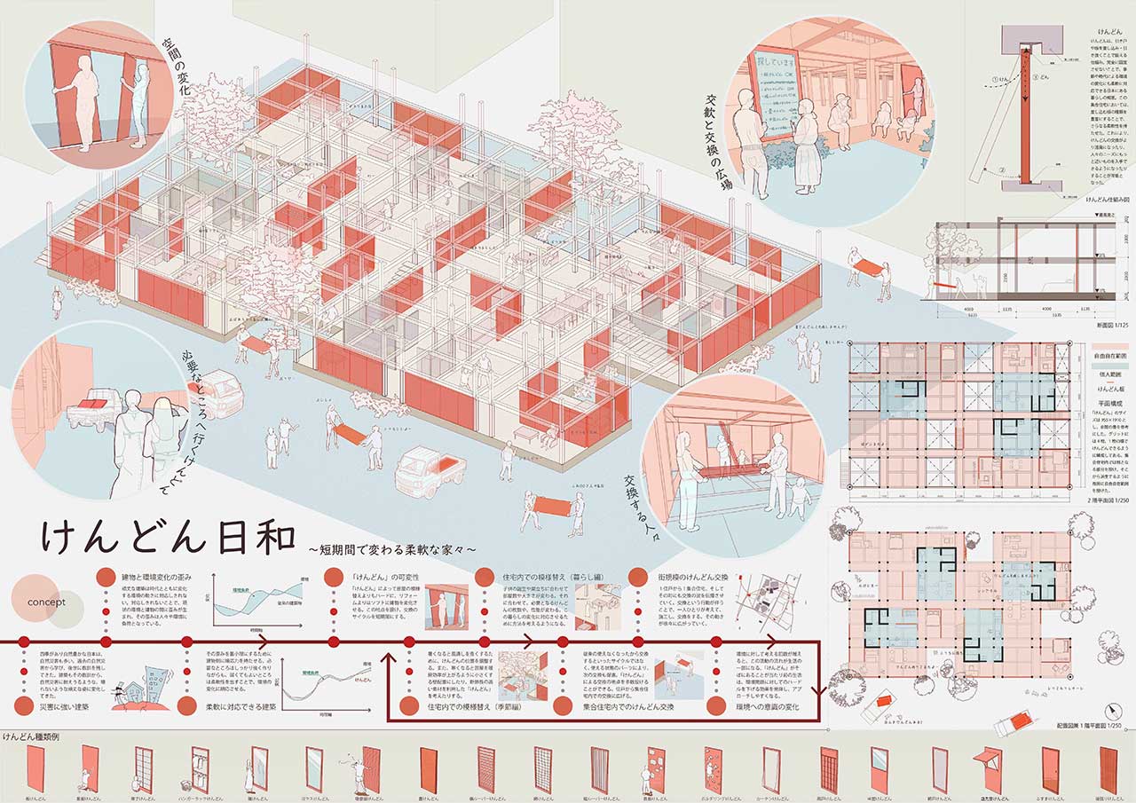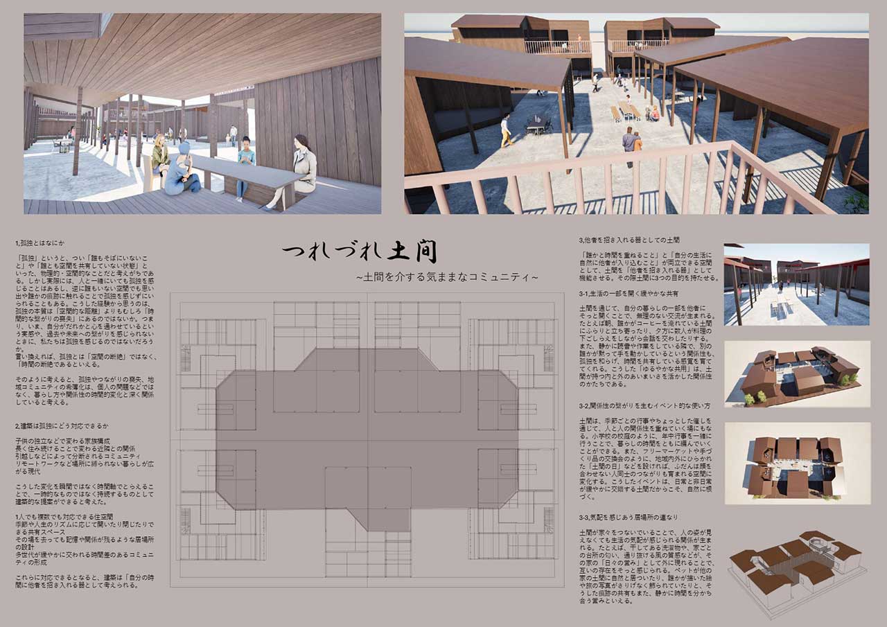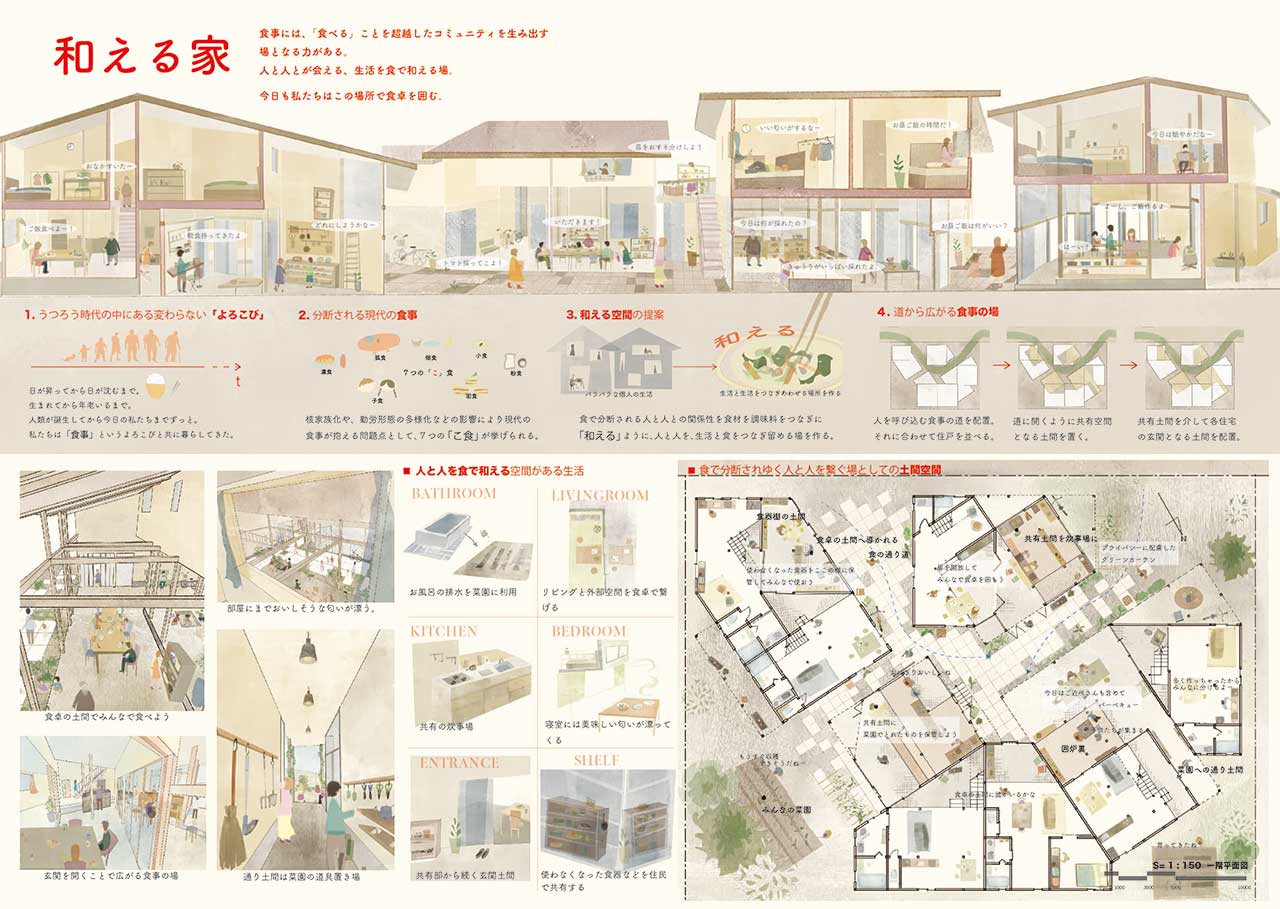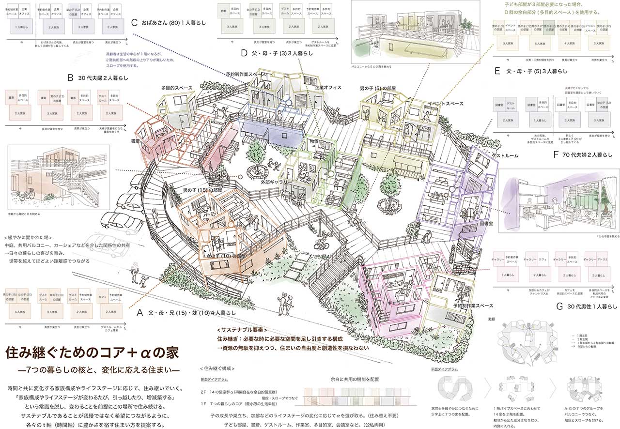 この度は最優秀賞に選出していただき、ありがとうございました。 今回は建築にとらわれず、あえて建築外の視点からアプローチしたことが評価され、大変光栄に思います。 この課題を通して、住み手側に自由を与えつつ、建築自体には、ある程度のルールと居場所を設けることで自由と秩序の両立を考えました。 審査会や懇親会を通して、新たな交流が生まれ、普段得ることのできないアドバイス頂き、卒業設計を含めた今後の設計の大いに活かせる学びとなりました。